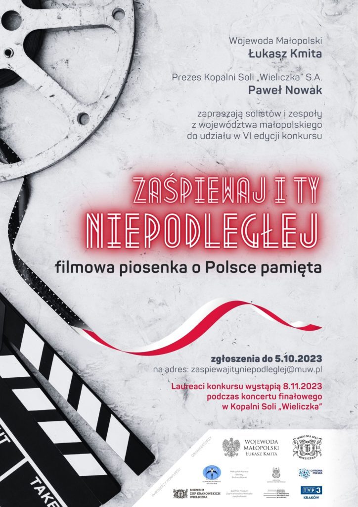 Wojewoda Małopolski Łukasz Kmita wraz z Prezesem Zarządu Kopalni Soli „Wieliczka” S.A Pawłem Nowakiem, Prezesem Zarządu Kopalni Soli „Wieliczka” Turystyka Sp. z o.o. Michałem Roehlichem, Małopolskim Kuratorem Oświaty Barbarą Nowak oraz Dyrektorem Muzeum Żup Krakowskich Wieliczka Janem Godłowskim serdecznie zapraszają uczniów szkół podstawowych z województwa małopolskiego do udziału w konkursie „zaŚPIEWAJ I TY NIEPODLEGŁEJ! VI edycja organizowanego pod hasłem Filmowa piosenka o Polsce pamięta.