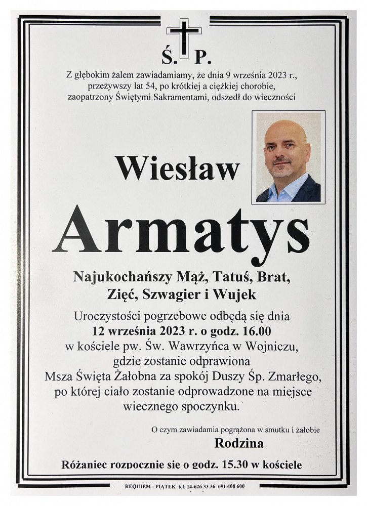 Ze smutkiem przyjęliśmy wiadomość o śmierci Wiesława Armatysa, zastępcy burmistrza Radłowa, samorządowca powiatu tarnowskiego, byłego Radnego Rady Gminnej w Wojniczu oraz pracownika Urzędu Miejskiego w Wojniczu. Łączymy się w bólu z rodziną, bliskimi, a także mieszkańcami gminy Radłów.