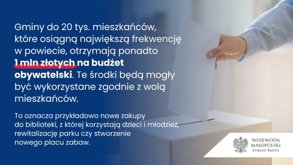Gminy do 20 tys. mieszkańców, które osiągną największą frekwencję w powiecie, otrzymają ponadto 1 mln złotych na budżet obywatelski. Te środki będą mogły być wykorzystane zgodnie z wolą mieszkańców. To oznacza przykładowo nowe zakupy do biblioteki, z której korzystają dzieci i młodzież, rewitalizację parku czy stworzenie nowego placu zabaw. O tym, co powstanie dzięki tym dodatkowym środkom, decydują mieszkańcy danej gminy.