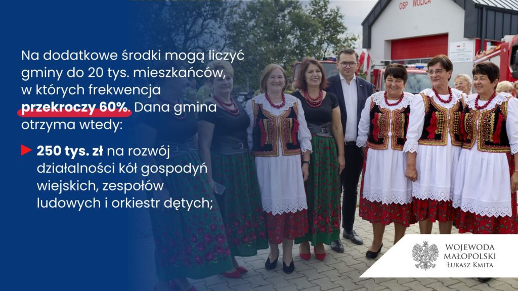 - 250 tys. zł na rozwój działalności kół gospodyń wiejskich, zespołów ludowych i orkiestr dętych;