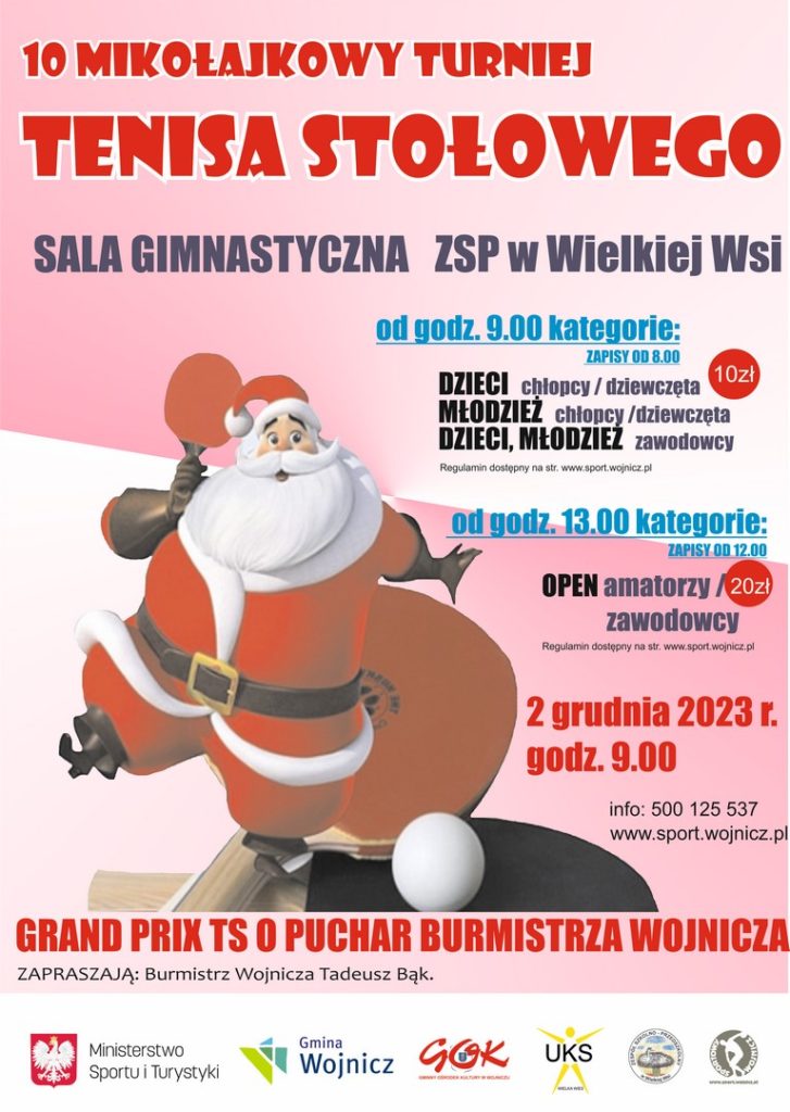 Zapraszamy wszystkich zawodników do udziału w 10 MIKOŁAJKOWYM TURNIEJU TENISA STOŁOWEGO. Jest to drugi z czterech w ramach cyklu Grand Prix o Puchar Burmistrza Wojnicza.