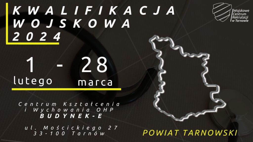 Już 1 lutego rusza Kwalifikacja Wojskowa w 2024 roku dla powiatu tarnowskiego i potrwa do 28 marca. Komisja jak co roku będzie mieściła się w Centrum Kształcenia i Wychowania OHP Budynek-E przy ul. Mościckiego 27 w Tarnowie.