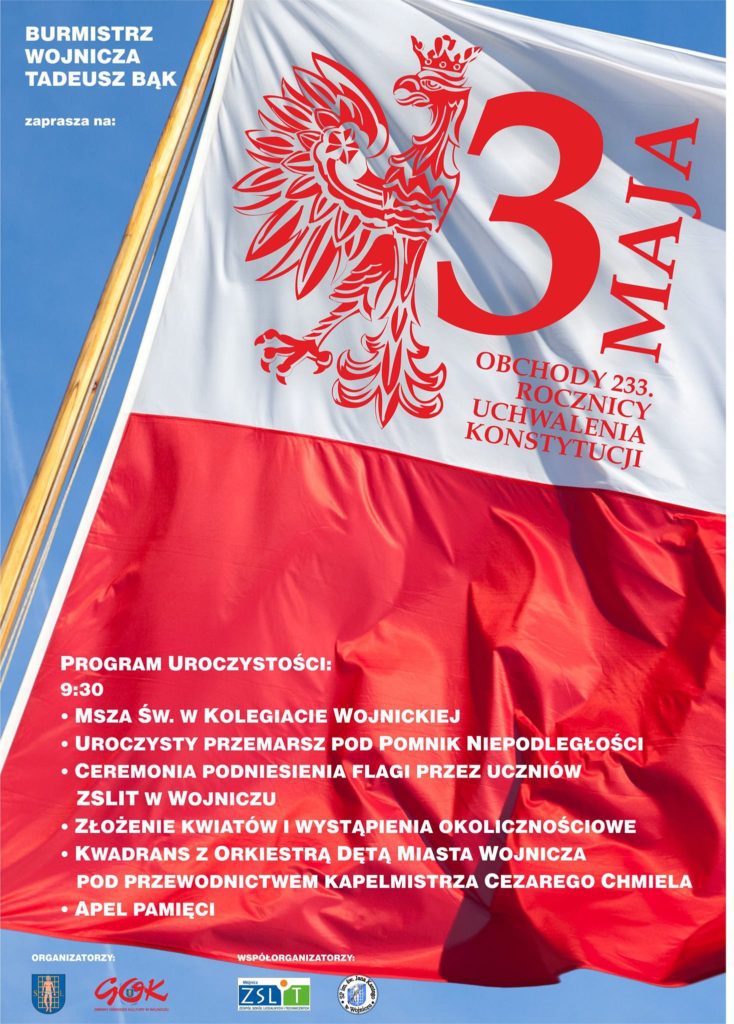 Burmistrz Wojnicza Tadeusz Bąk serdecznie zaprasza na Uroczyste Obchody 233. rocznicy Święta Konstytucji 3 Maja w Wojniczu.