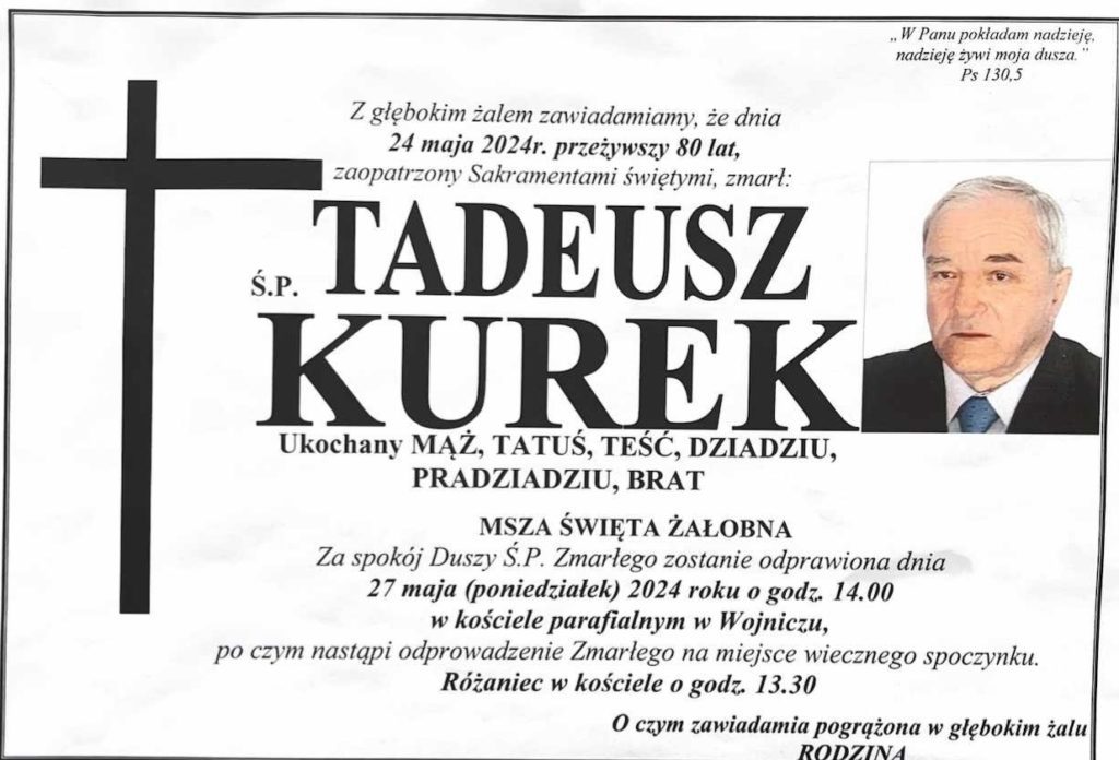 Z głębokim żalem i smutkiem przyjęliśmy wiadomość o śmierci śp. Tadeusza Kurka. W imieniu własnym, Radnych Rady Miejskiej w Wojniczu oraz pracowników Urzędu Miejskiego składam najgłębsze wyrazy żalu i współczucia oraz słowa otuchy i kondolencje dla Pani Joanny Zając Skarbnika Gminy Wojnicz z powodu śmierci Taty. Wyrazy głębokiego współczucia i żalu składamy również Rodzinie i bliskim.