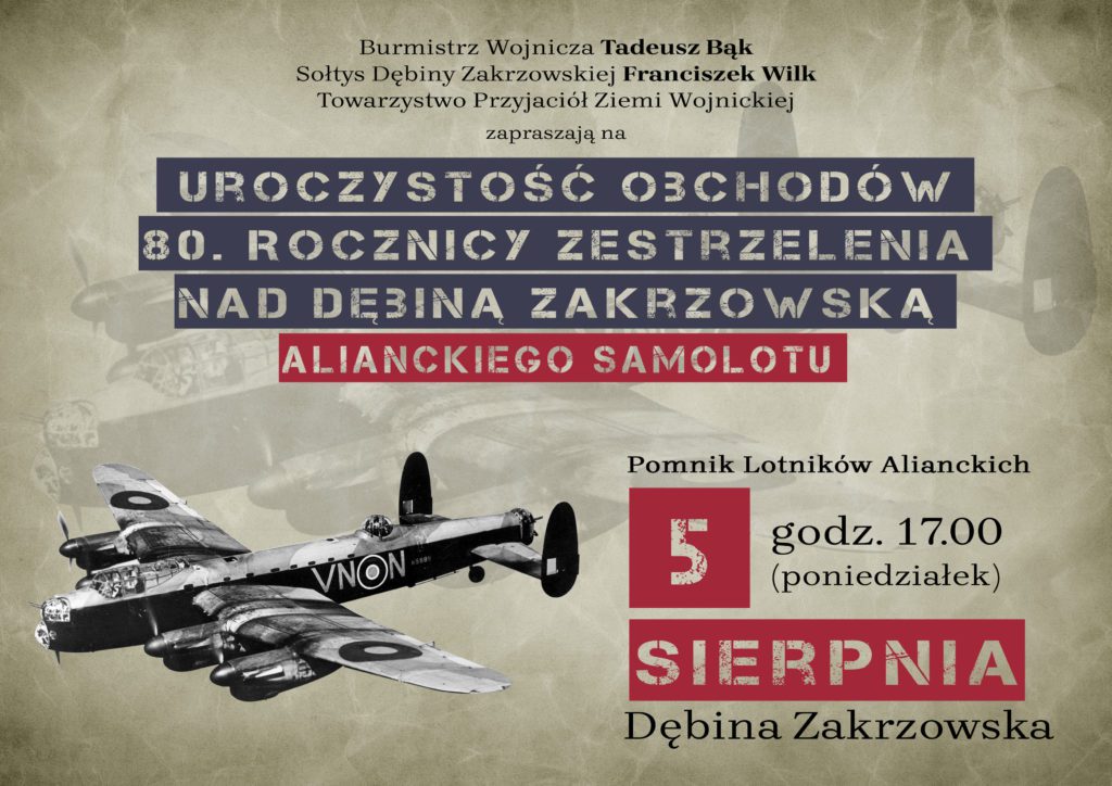 Z okazji 80. rocznicy zestrzelenia alianckiego samolotu w Dębinie Zakrzowskiej koło Wojnicza Burmistrz Wojnicza Tadeusz Bąk wspólnie z Sołtys Dębiny Zakrzowskiej Franciszek Wilk oraz Towarzystwo Przyjaciół Ziemi Wojnickiej zaprasza pod Pomnik Lotników Alianckich w Dębinie Zakrzowskiej – 5 sierpnia o godz. 17.00, gdzie organizowana jest uroczystość jej obchodów.