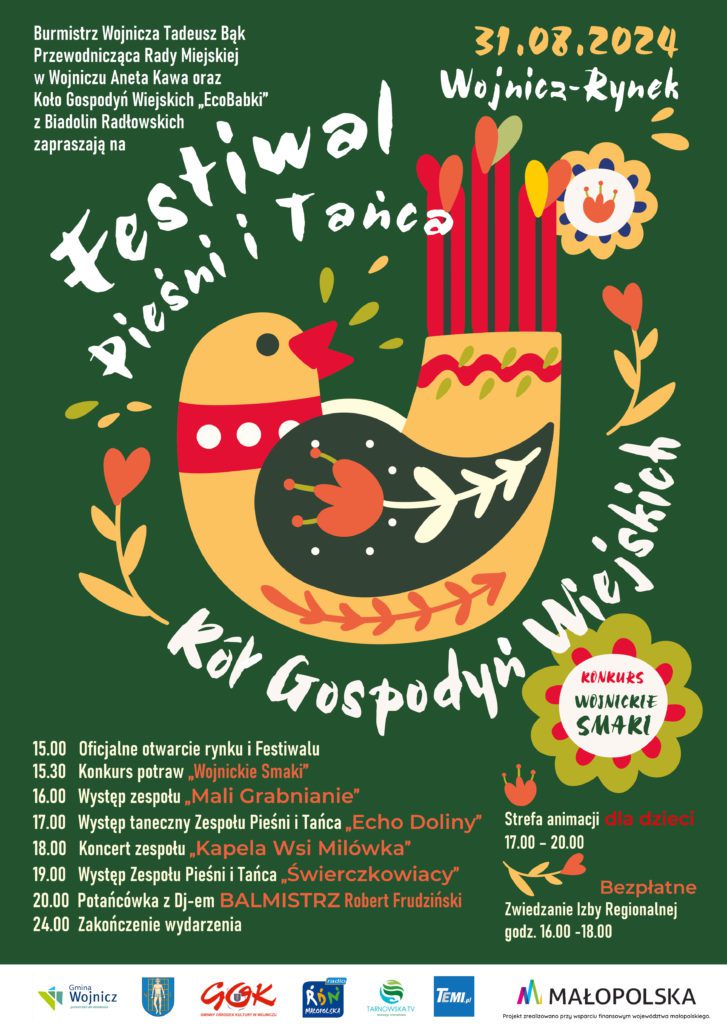 Wojnickie pożegnanie wakacji! Już w sobotę, 31 sierpnia na mieszkańców Gminy Wojnicz będzie czekać moc atrakcji. Na terenie wojnickiego rynku odbędzie się Festiwal Pieśni i Tańca Kół Gospodyń Wiejskich organizowany przez samorząd wojnicki, Koło Gospodyń Wiejskich „EcoBabki” z Biadolin Radłowskich przy współpracy z GOK Wojnicz. Co nas czeka? Będą to m.in. degustacja potraw regionalnych, koncert i występy taneczne lokalnych zespołów. Jako gwiazda wieczoru na scenie wystąpi Zespół Pieśni i Tańca „Świerczkowiacy”. Wydarzenie zakończy potańcówka z udziałem Dj-a.