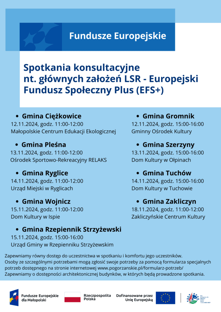 Pogórzańskie Stowarzyszenie Dunajec-Biała zaprasza na otwarte spotkania konsultacyjne prowadzone w ramach kampanii informacyjnej na temat głównych założeń Lokalnej Strategii Rozwoju na lata 2023-2027. Podczas spotkań przedstawione zostaną m.in. główne cele LSR oraz przedsięwzięcia realizowane z Europejskiego Funduszu Społecznego Plus (EFS+).