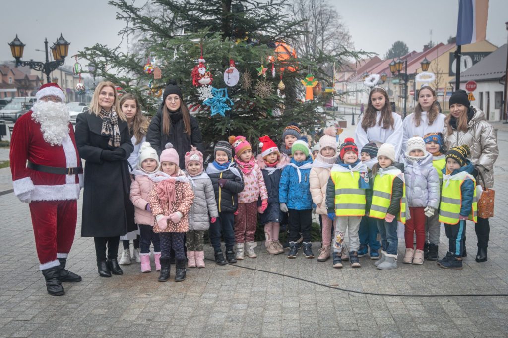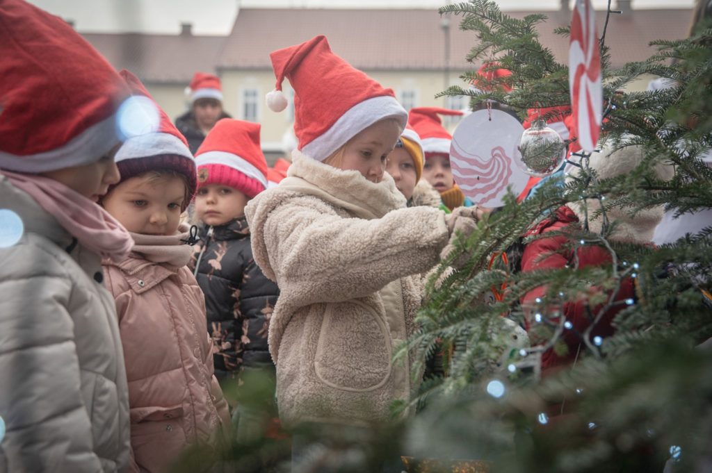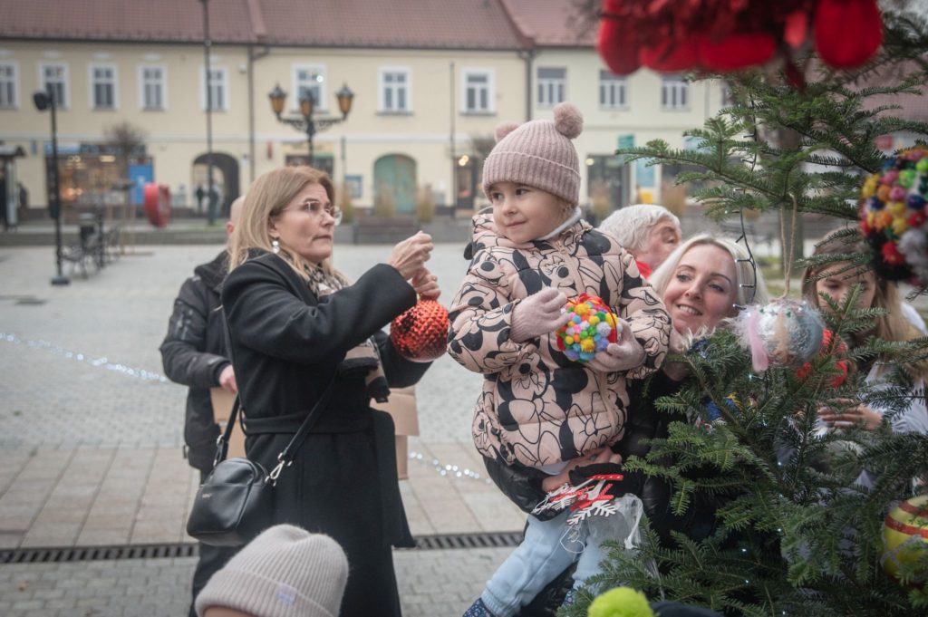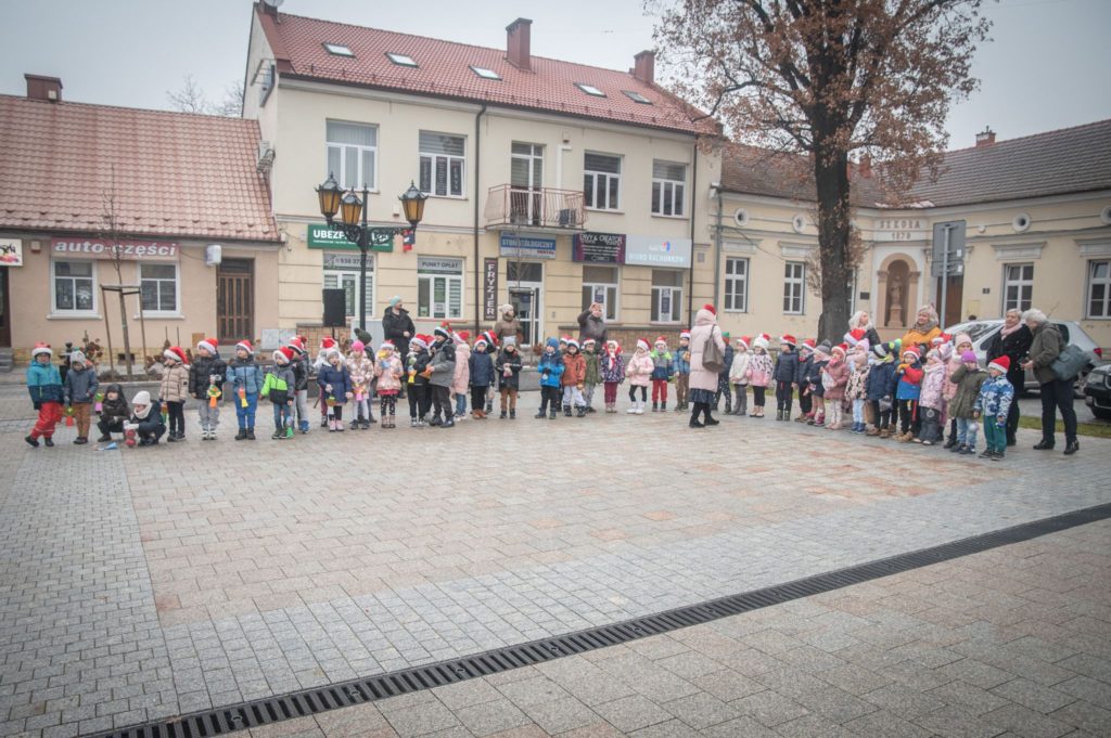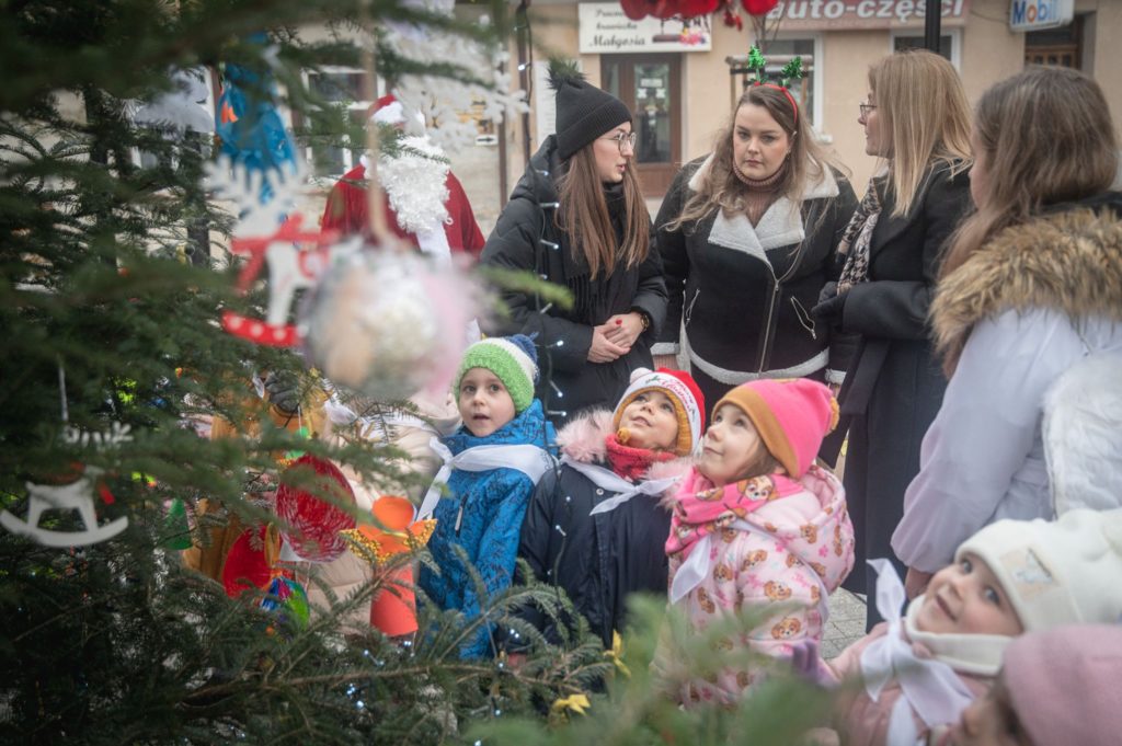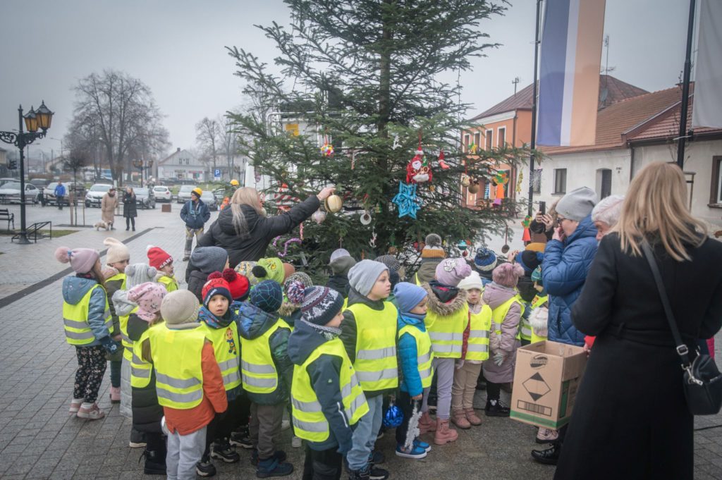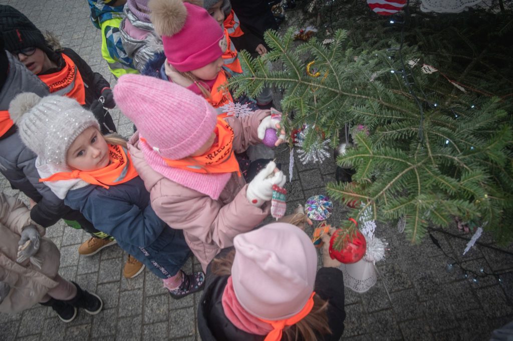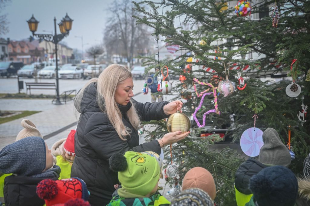 Maluchy ze żłobka i przedszkoli, w towarzystwie swoich opiekunów oraz nauczycieli, z zapałem wieszały własnoręcznie wykonane ozdoby na świątecznym drzewku. Każda z dekoracji była jedyna w swoim rodzaju i dodawała unikalnego uroku choince, która teraz dumnie zdobi rynek, będąc symbolem wspólnoty i radosnego oczekiwania na Święta Bożego Narodzenia.