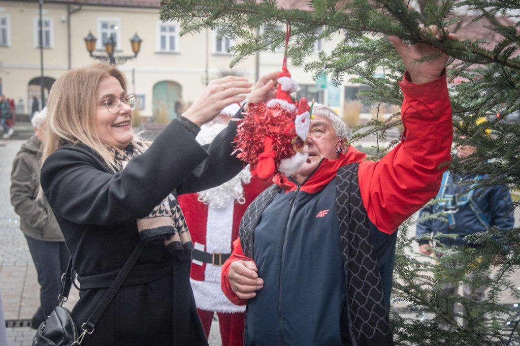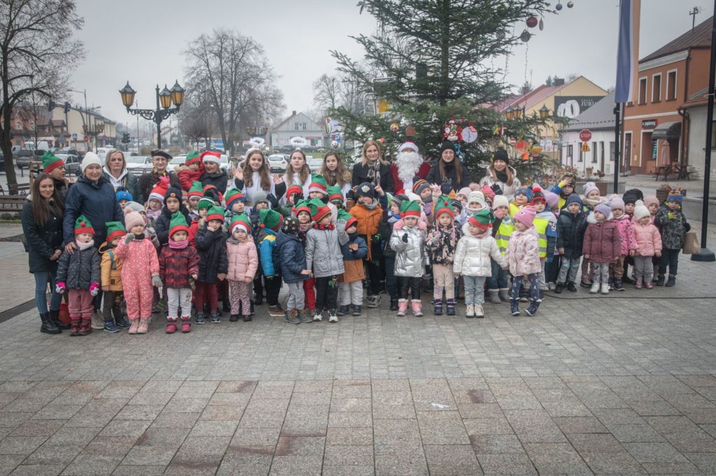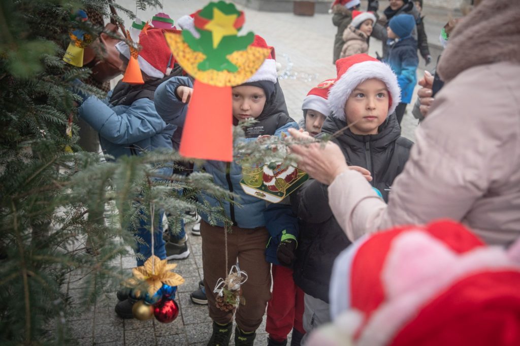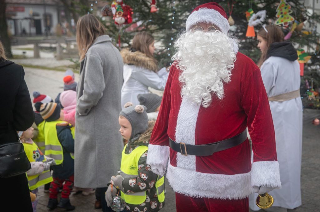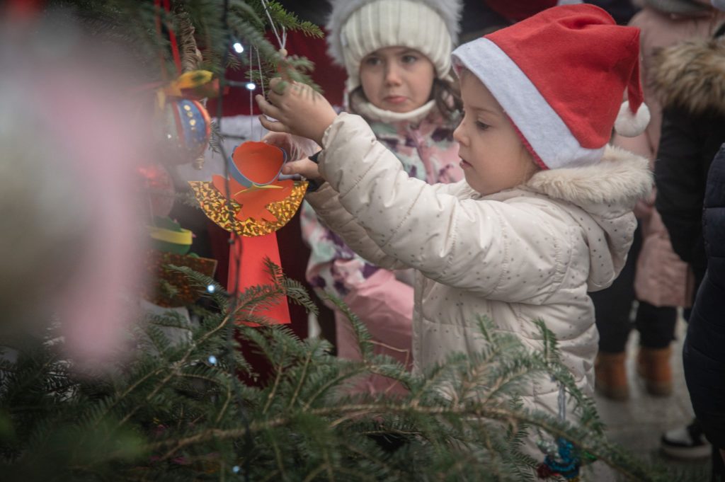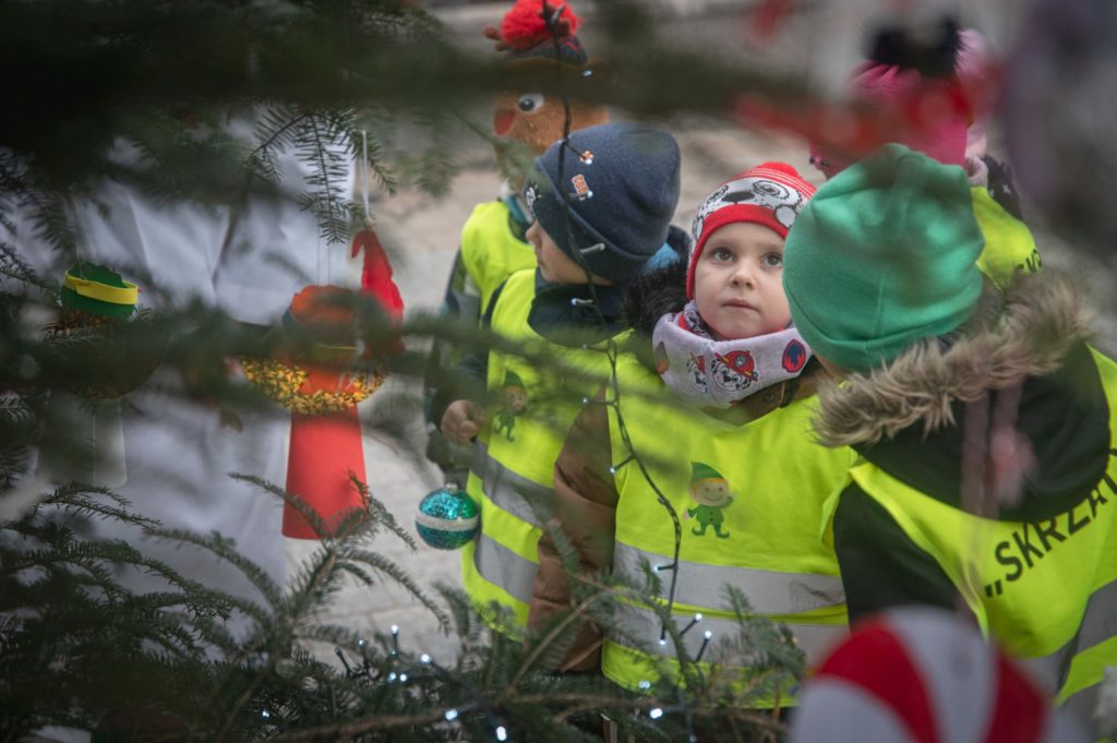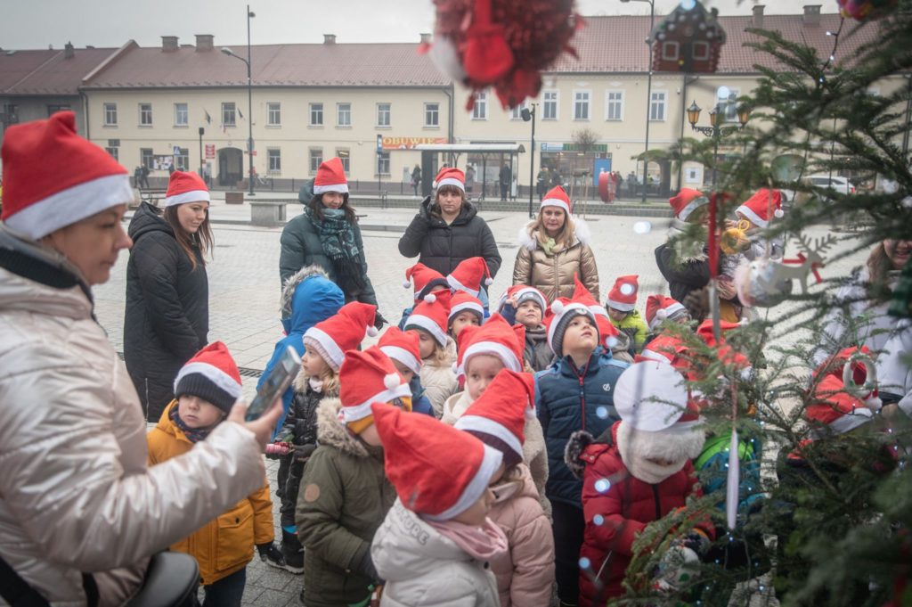 Maluchy ze żłobka i przedszkoli, w towarzystwie swoich opiekunów oraz nauczycieli, z zapałem wieszały własnoręcznie wykonane ozdoby na świątecznym drzewku. Każda z dekoracji była jedyna w swoim rodzaju i dodawała unikalnego uroku choince, która teraz dumnie zdobi rynek, będąc symbolem wspólnoty i radosnego oczekiwania na Święta Bożego Narodzenia.
