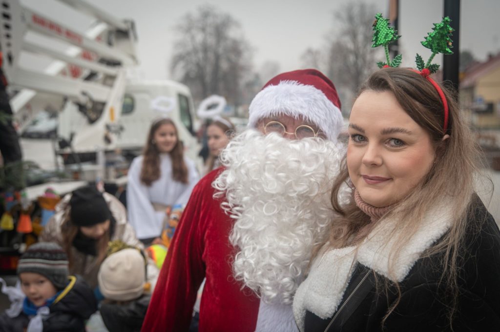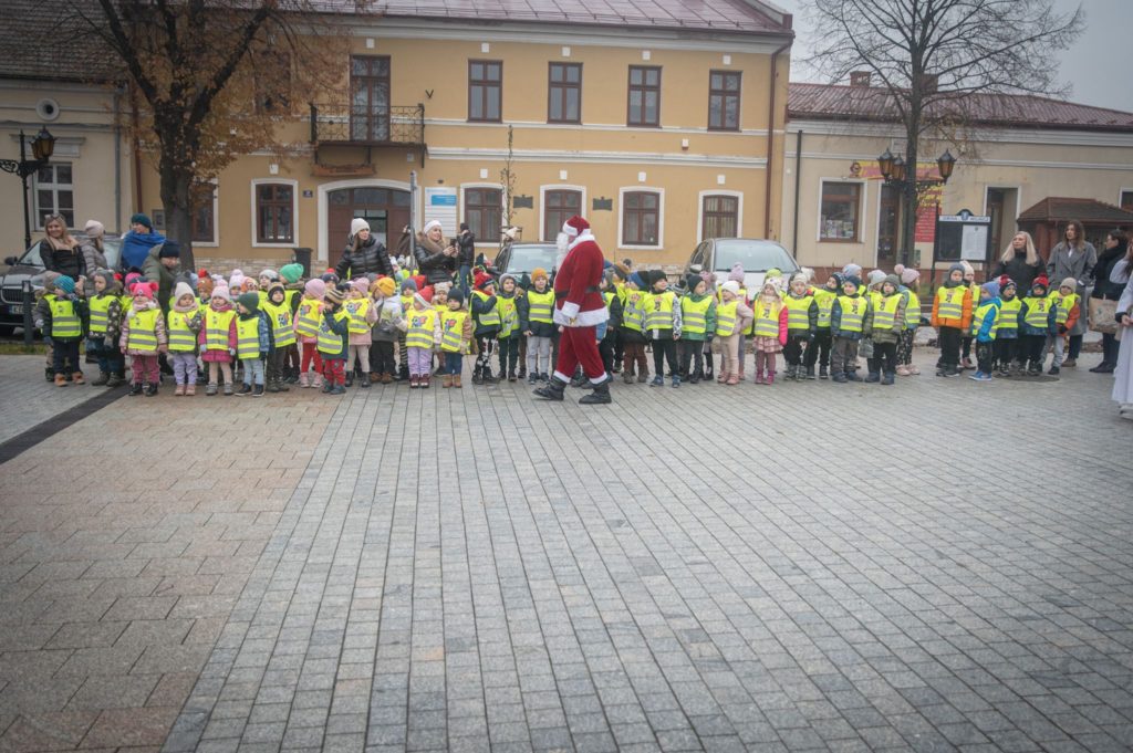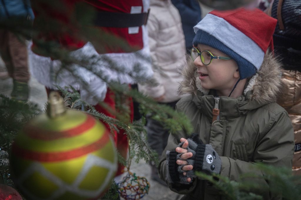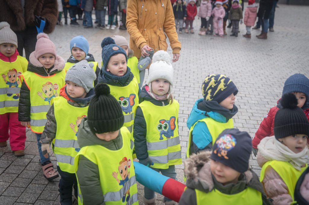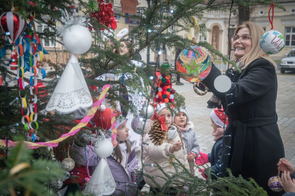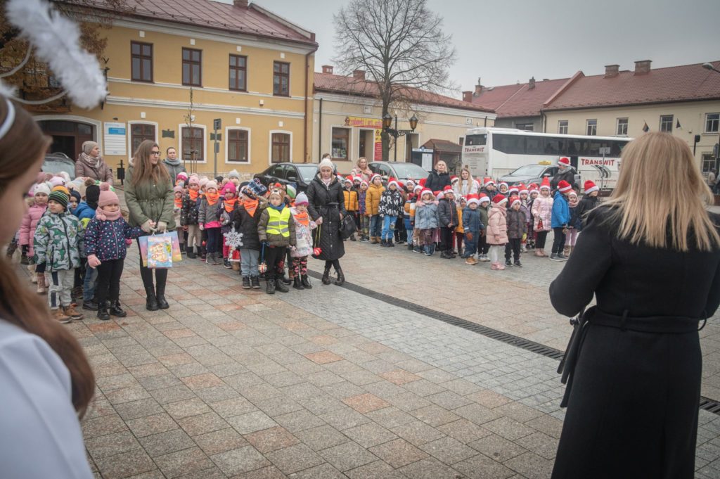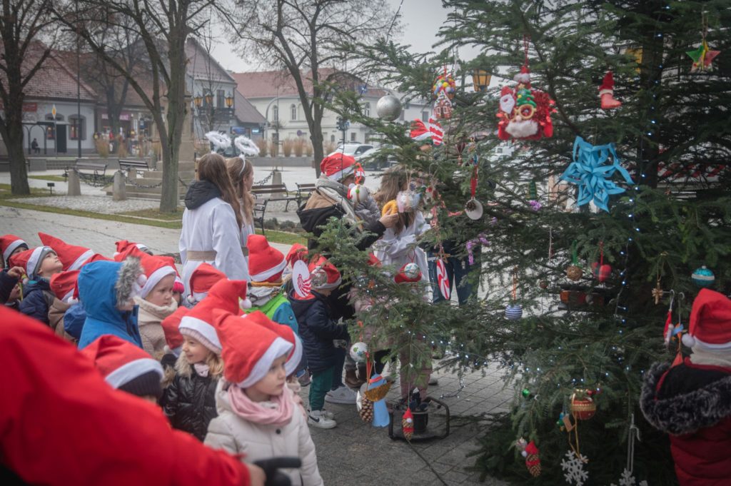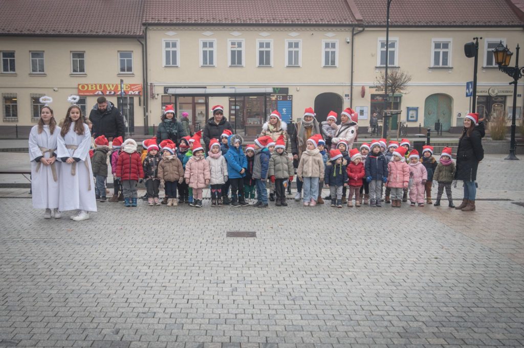 Maluchy ze żłobka i przedszkoli, w towarzystwie swoich opiekunów oraz nauczycieli, z zapałem wieszały własnoręcznie wykonane ozdoby na świątecznym drzewku. Każda z dekoracji była jedyna w swoim rodzaju i dodawała unikalnego uroku choince, która teraz dumnie zdobi rynek, będąc symbolem wspólnoty i radosnego oczekiwania na Święta Bożego Narodzenia.