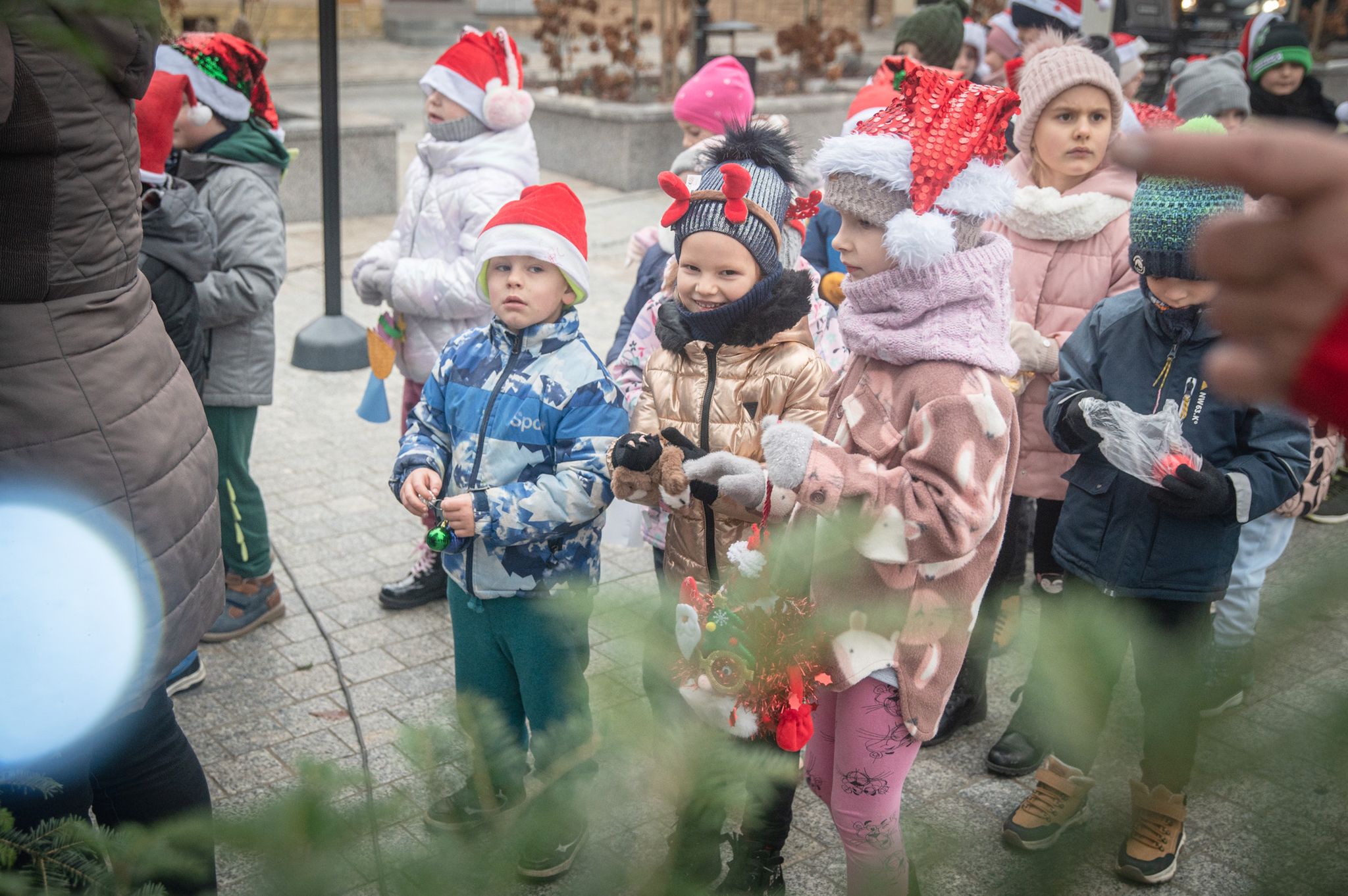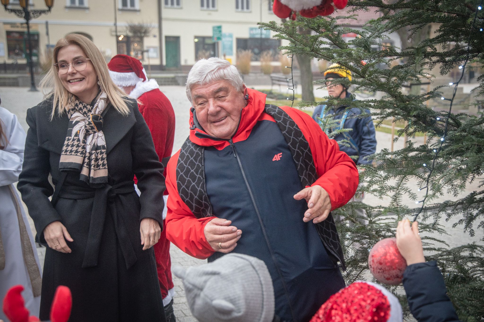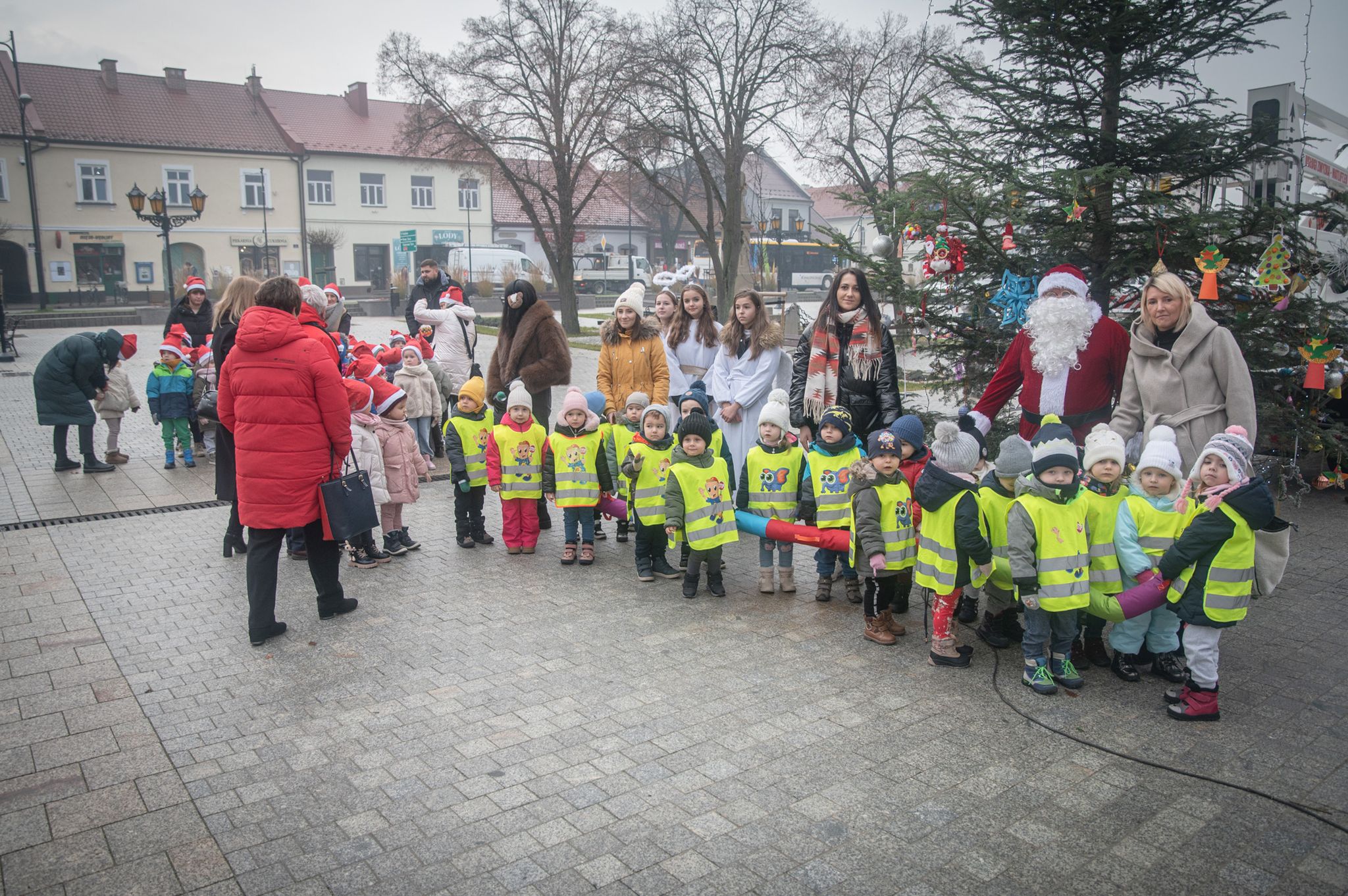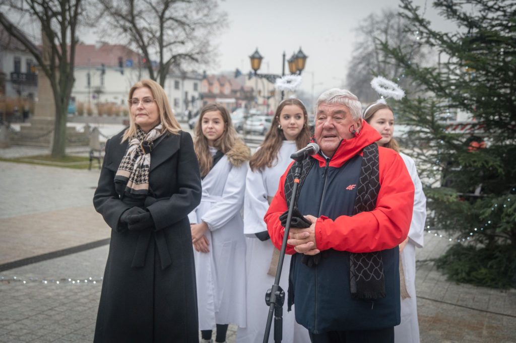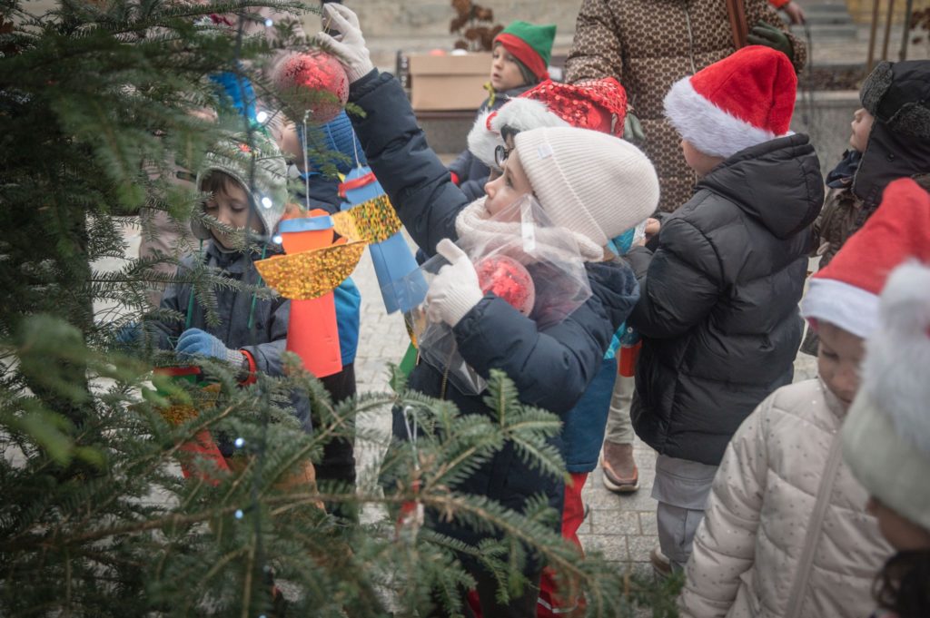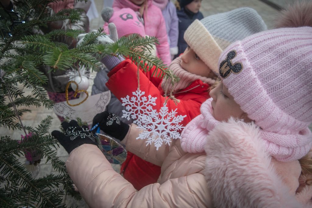 Maluchy ze żłobka i przedszkoli, w towarzystwie swoich opiekunów oraz nauczycieli, z zapałem wieszały własnoręcznie wykonane ozdoby na świątecznym drzewku. Każda z dekoracji była jedyna w swoim rodzaju i dodawała unikalnego uroku choince, która teraz dumnie zdobi rynek, będąc symbolem wspólnoty i radosnego oczekiwania na Święta Bożego Narodzenia.