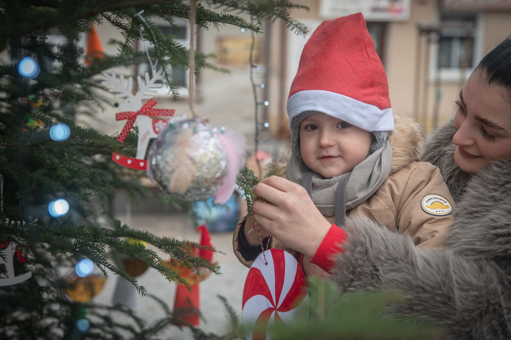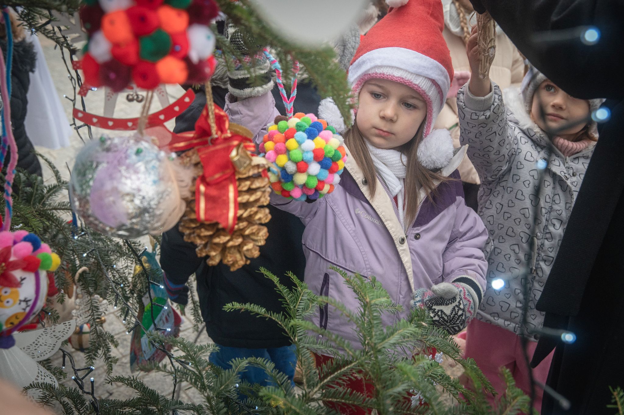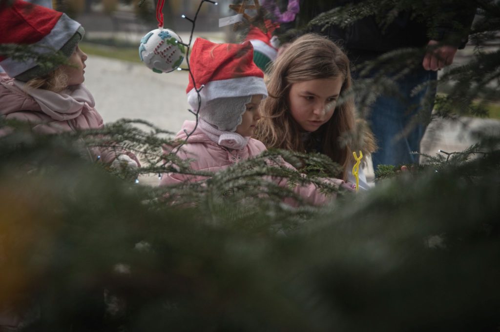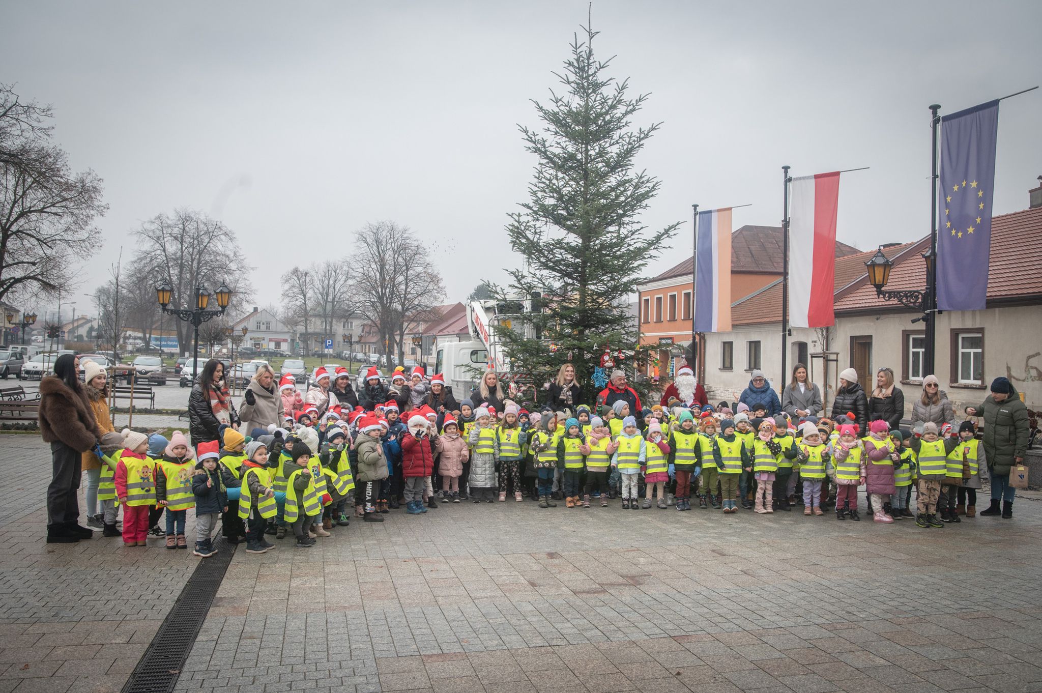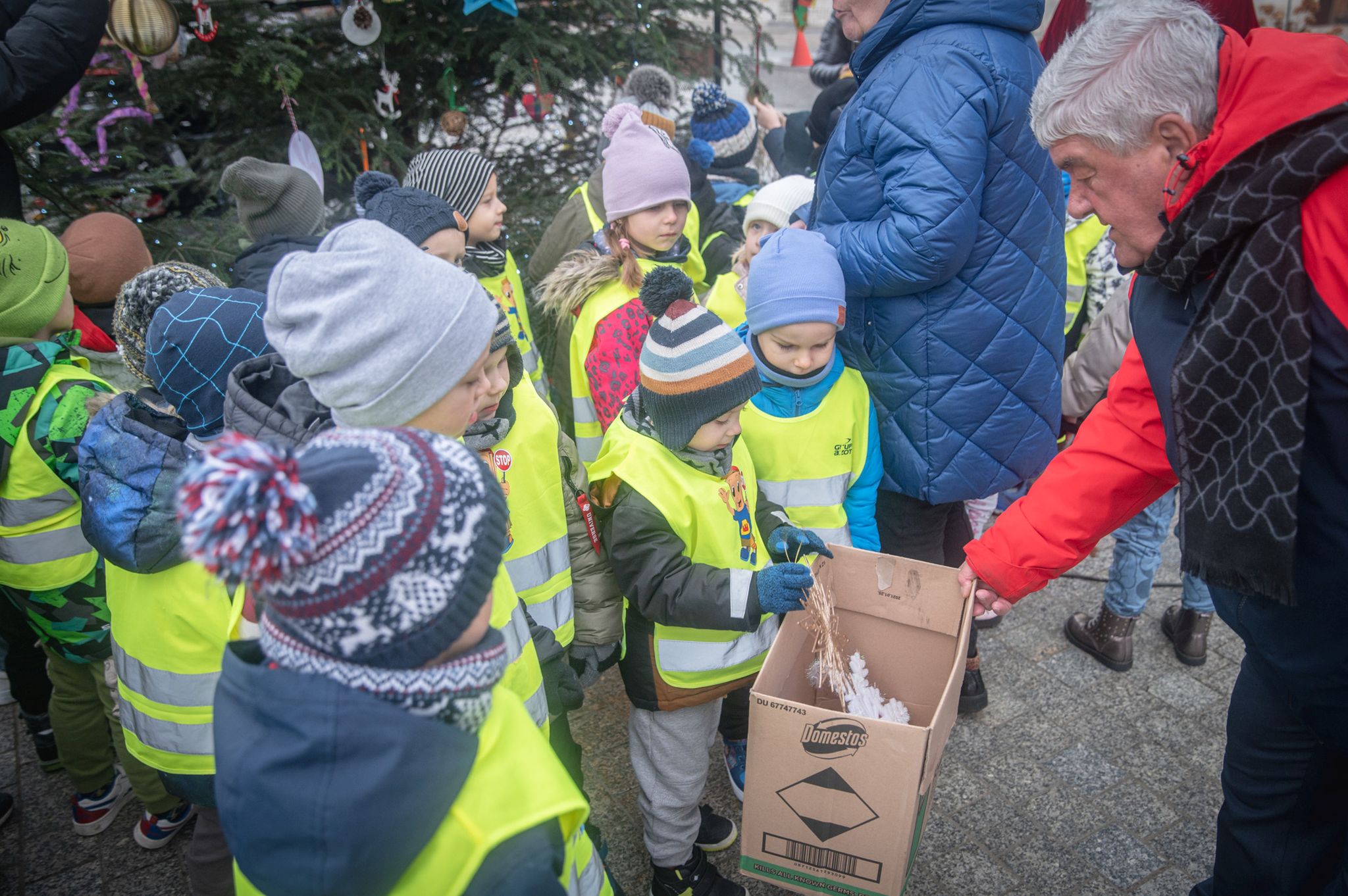 Maluchy ze żłobka i przedszkoli, w towarzystwie swoich opiekunów oraz nauczycieli, z zapałem wieszały własnoręcznie wykonane ozdoby na świątecznym drzewku. Każda z dekoracji była jedyna w swoim rodzaju i dodawała unikalnego uroku choince, która teraz dumnie zdobi rynek, będąc symbolem wspólnoty i radosnego oczekiwania na Święta Bożego Narodzenia.
