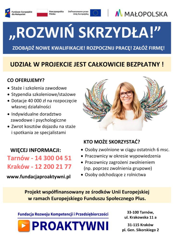 Fundacja Rozwoju Kompetencji i Przedsiębiorczości PROAKTYWNI zaprasza do udziału w X edycji projektu „Rozwiń SKRZYDŁA!”, współfinansowanego ze środków Europejskiego Funduszu Społecznego Plus w ramach programu Fundusze Europejskie dla Małopolski 2021-2027, Priorytetu 6. Fundusze europejskie dla rynku pracy, edukacji i włączenia społecznego, Działania 6.6 Rozwój kompetencji kadr i adaptacja do zmian.