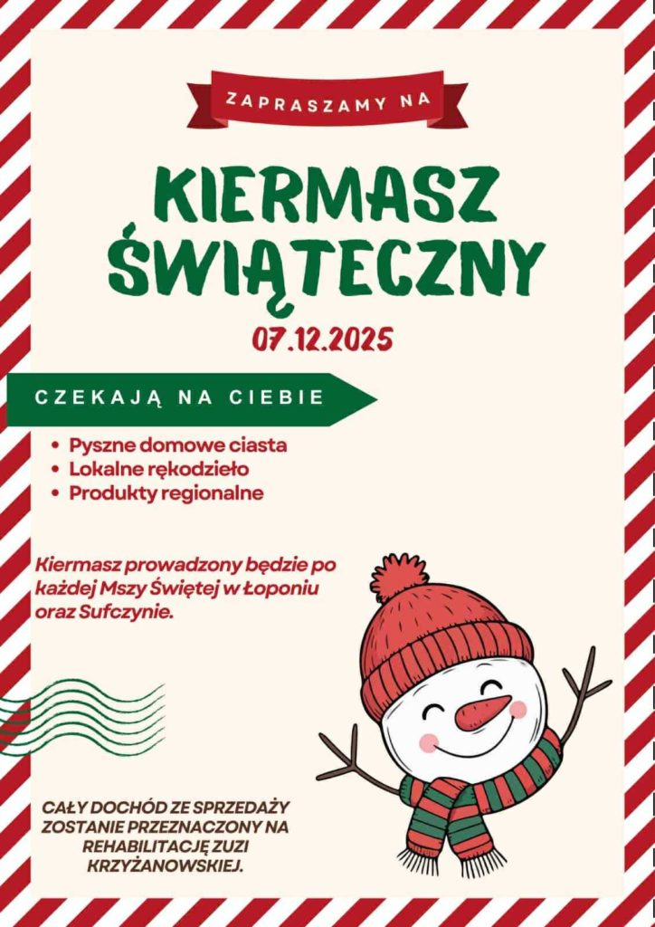 Zapraszamy na Świąteczny Kiermasz charytatywny na rzecz rehabilitacji Zuzi Krzyżanowskiej. Kiermasz odbędzie się 7 grudnia po każdej Mszy Świętej w miejscowościach Łopoń i Sufczyn. Na stoiskach będzie można znaleźć domowe ciasta i wypieki, lokalne rękodzieło oraz produkty regionalne, idealne na świąteczne prezenty.