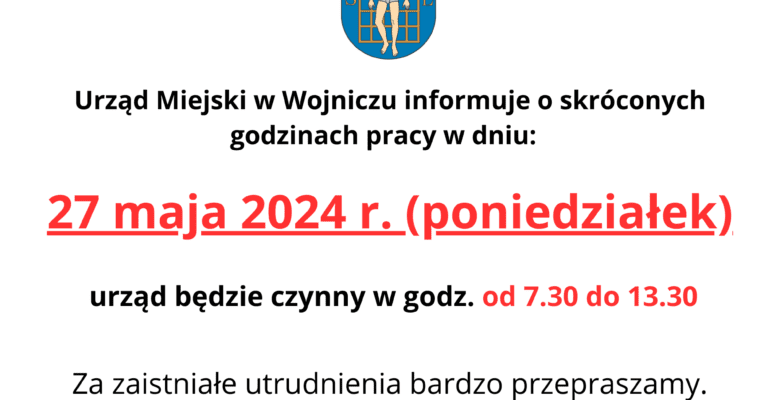Urząd Miejski w Wojniczu informuje o skróconych godzinach pracy w dniu: 27 maja (poniedziałek) 2024 r., urząd będzie czynny …