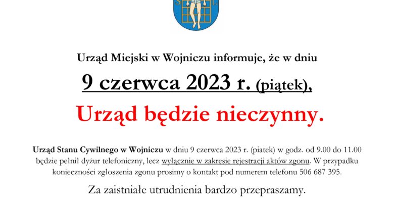 Urząd Miejski w Wojniczu informuje, że w dniu 9 czerwca 2023 r. (piątek), Urząd będzie nieczynny. Urząd Stanu Cywilnego w …