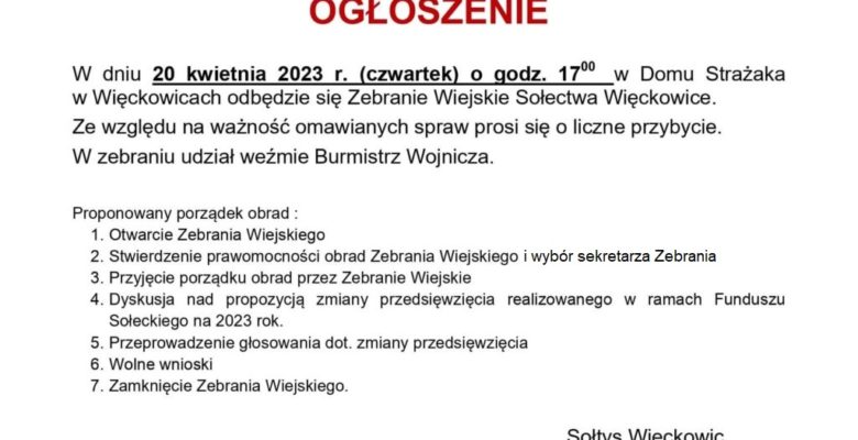 Sołtys Więckowic serdecznie zaprasza wszystkich mieszkańców sołectwa na Zebranie Wiejskie, które odbędzie się w dniu 20 kwietnia …