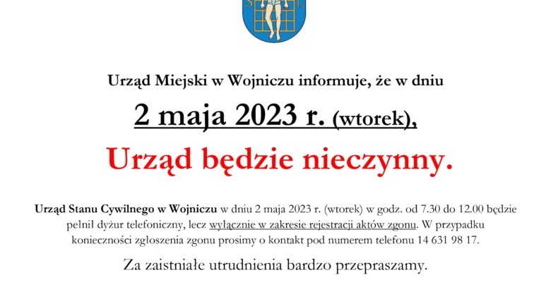 Urząd Miejski w Wojniczu informuje, że w dniu 2 maja 2023 r. (wtorek), Urząd będzie nieczynny. Urząd Stanu Cywilnego w …