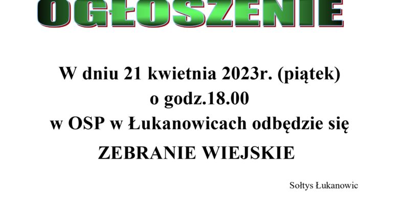 Sołtys Łukanowic serdecznie zaprasza wszystkich mieszkańców sołectwa na zebranie wiejskie, które odbędzie się w dniu 21 kwietnia …
